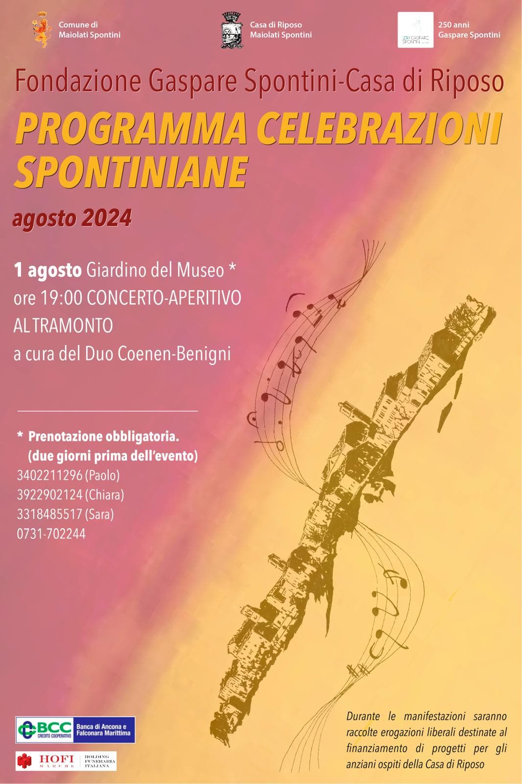 Gli eventi del 20/07 e del 01/08 sono a ingresso libero con prenotazione obbligatoria (almeno due giorni prima dell’evento) ai numeri +390731702244 (Fondazione G. Spontini) e +393402211296 (Paolo Perticaroli).