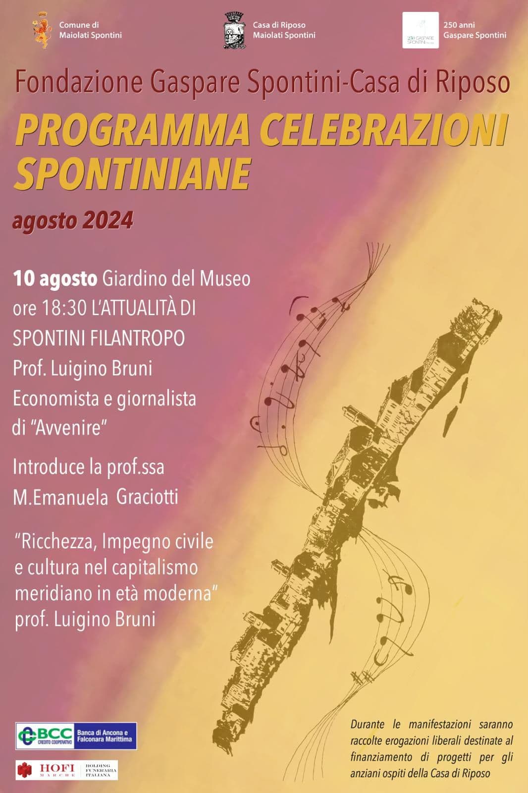 10 agosto 2024 ore 18:30 – Conferenza L’attualità di Spontini filantropo con il prof. Luigino Bruni (economista e giornalista “L’Avvenire”). Modera la prof.ssa Maria Emanuela Graciotti.