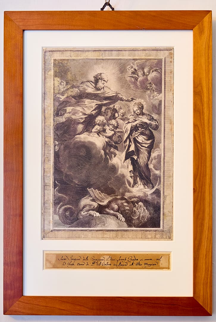 Appese alle pareti si vedono due stampe: Santa Rita da Cascia e la Madonna Immacolata con il Padre Eterno e gli Angeli.
