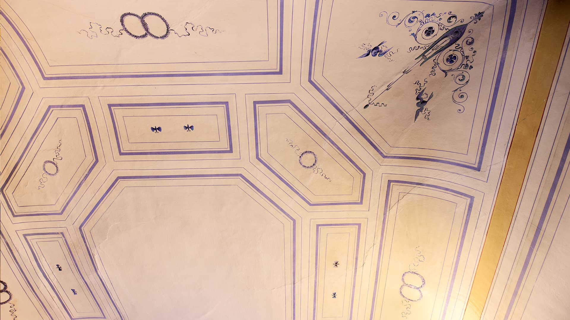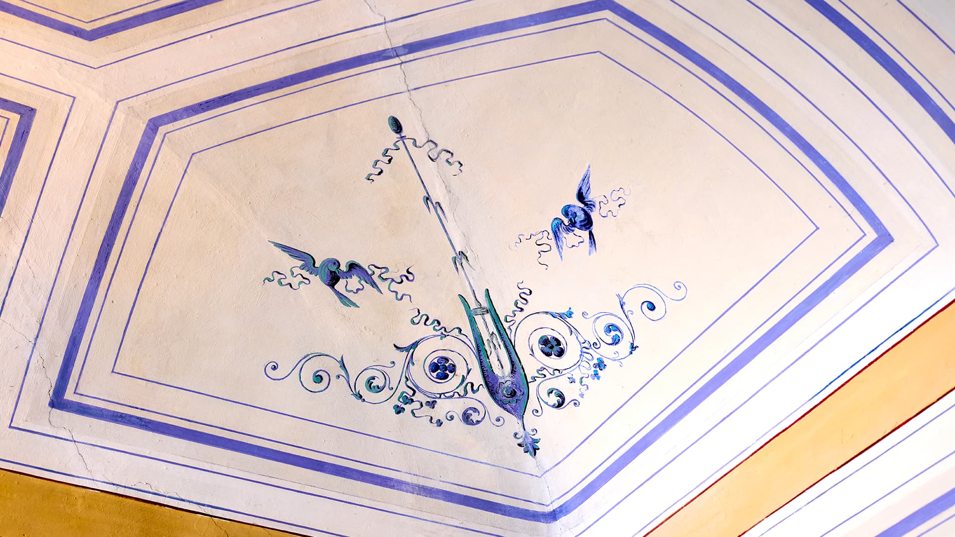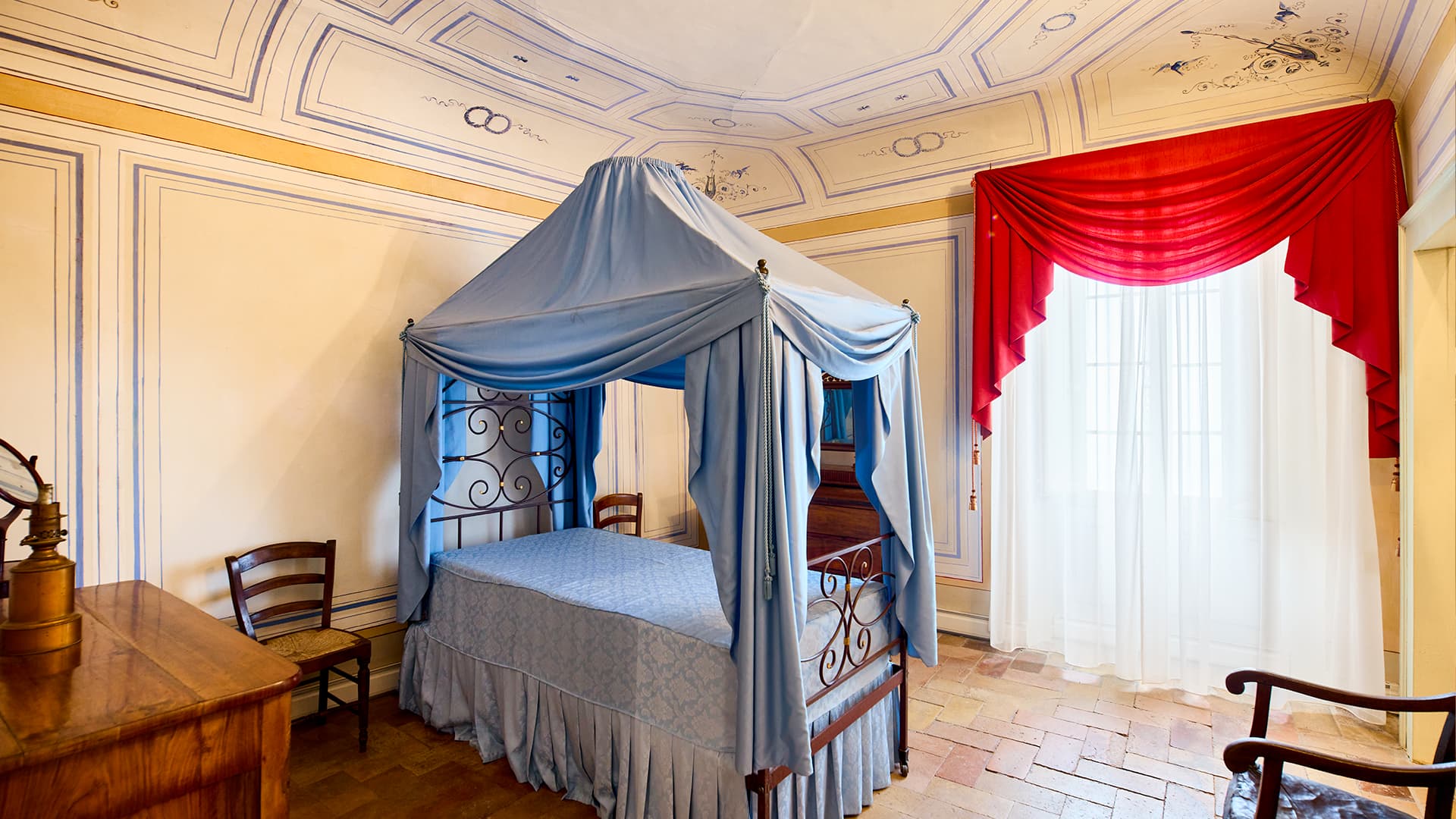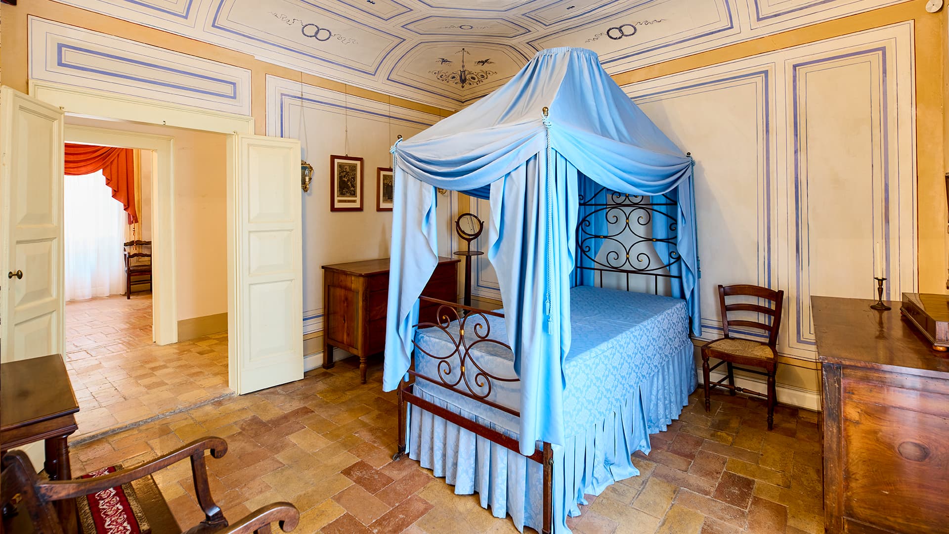Il soffitto della camera da letto in celeste e azzurro è decorato ai quattro angoli con la cetra, identica a quella che si trova nel cancello di ingresso del parco Colle Celeste. Il letto a baldacchino in ferro battuto, con coperta e tende azzurre, risale alla prima metà del XIX secolo. Dello stesso periodo sono i due cassettoni per vestiti: su quello di destra si nota una specchiera rettangolare con cornice lignea intagliata, su quello di sinistra una lampada a petrolio.